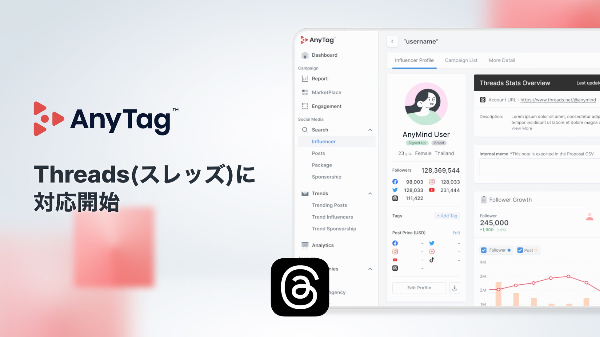 AnyMind Group株式会社(読み:エニーマインドグループ、代表取締役CEO:十河 宏輔、以下「当社」) が提供するインフルエンサーマーケティングプラットフォーム「AnyTag」が、Meta社のSNS「Threads(スレッズ)」でのキャンペーン及び投稿データの管理に対応開始いたします。