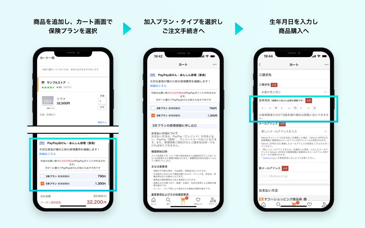また、本保険は「Yahoo!ショッピング」で家具を購入する際、カート画面で加入したいプランを選択することにより、ワンストップで加入できます。万が一補償期間中に商品が破損や汚損、故障してしまった場合、スマートフォンもしくはパソコンから簡単に手続きができます。保険料は、PayPay残高やYahoo!ウォレット登録のクレジットカードで支払えます。