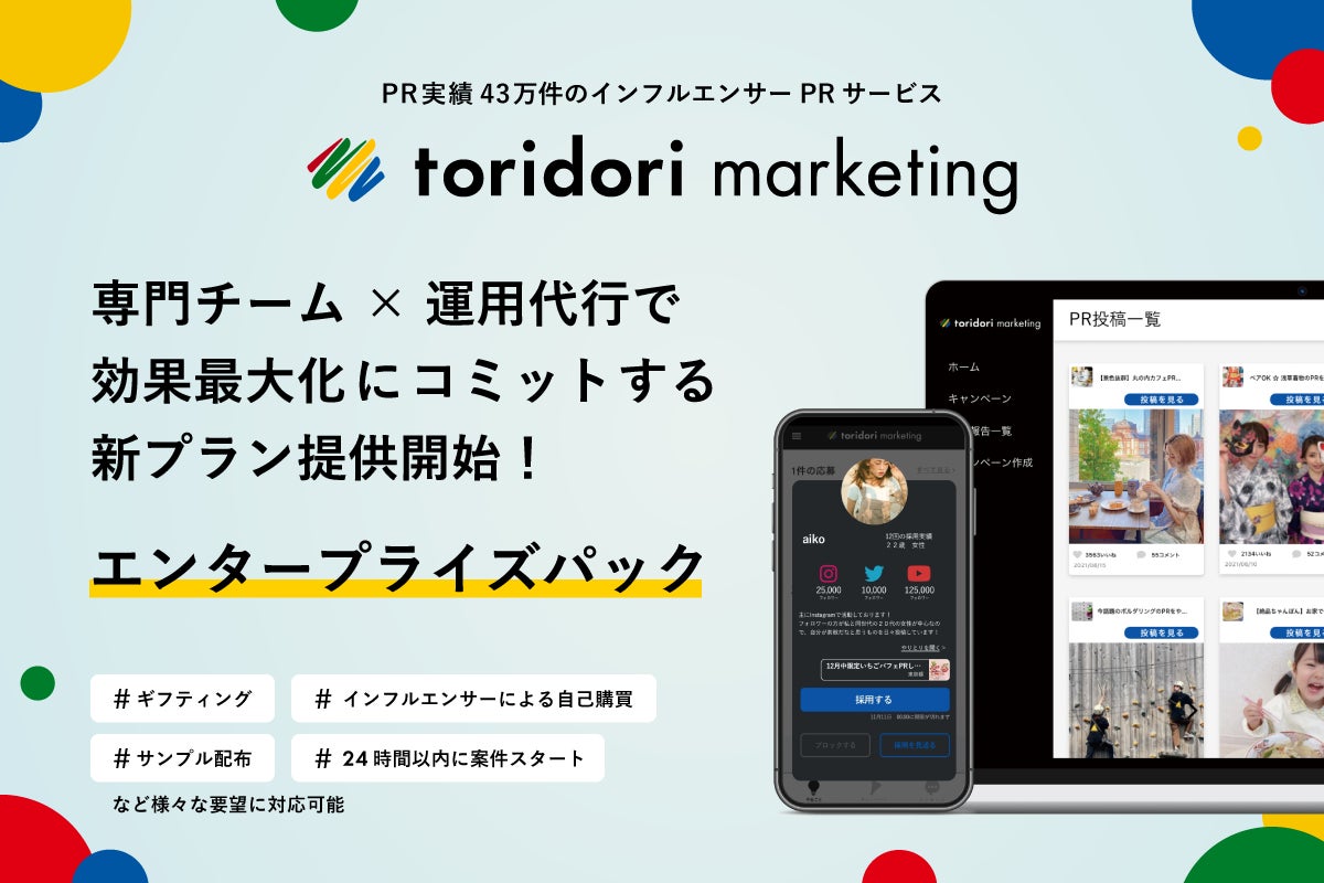 各種インフルエンス・プラットフォーム事業を展開する株式会社トリドリ(本社:東京都渋谷区、代表取締役社長CEO:中山 貴之、東証グロース:9337、以下toridori)は、当社が運営するPR実績43万件を超えるインフルエンサーマーケティングプラットフォーム『toridori marketing(トリドリマーケティング)』において、専門の運用代行チームが効果最大化にコミットする新商品『toridori marketing エンタープライズパック』(以下エンタープライズパック)を提供開始いたしました。