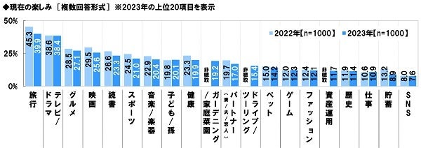 男女別にみると、男性では1位「旅行」(39.0%)、2位「テレビ/ドラマ」(31.8%)、3位「スポーツ」(29.8%)、4位「映画」(25.6%)、5位「グルメ」(23.8%)、女性では1位「テレビ/ドラマ」(45.0%)、2位「旅行」(40.8%)、3位「グルメ」(30.4%)、4位「映画」(25.6%)、5位「子ども/孫」(25.4%)でした。