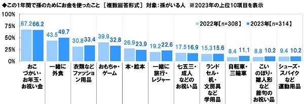 孫がいるシニア(314名)に、この1年間で、孫のためにどのようなことにお金を使ったか聞いたところ、1位「おこづかい・お年玉・お祝い金」(66.2%)、2位「一緒に外食」(49.7%)、3位「衣類などファッション用品」(33.4%)、4位「おもちゃ・ゲーム」(32.8%)、5位「本・絵本」(23.9%)となりました。