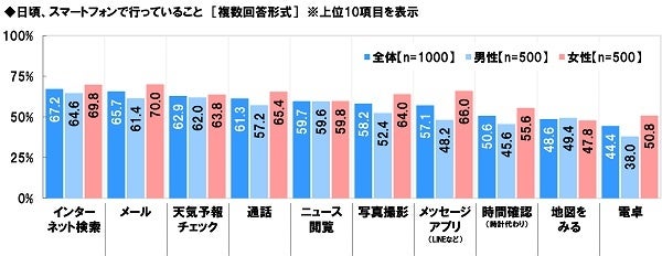 全回答者(1,000名)に、日頃、スマートフォンで行っていることを聞いたところ、1位「インターネット検索」(67.2%)、2位「メール」(65.7%)、3位「天気予報チェック」(62.9%)、4位「通話」(61.3%)、5位「ニュース閲覧」(59.7%)となりました。