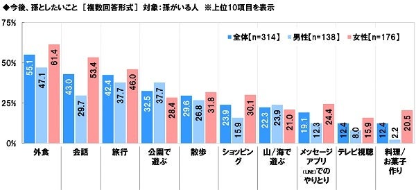 孫がいるシニア(314名)に、今後、孫とどのようなことをしたいと思うか聞いたところ、1位「外食」(55.1%)、2位「会話」(43.0%)、3位「旅行」(42.4%)、4位「公園で遊ぶ」(32.5%)、5位「散歩」(29.6%)となりました。