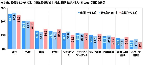配偶者がいるシニア(682名)に、今後、配偶者とどのようなことをしたいと思うか聞いたところ、1位「旅行」(64.1%)、2位「外食」(50.6%)、3位「会話」(33.3%)、4位「散歩」(33.1%)、5位「ショッピング」(28.7%)となりました。配偶者と一緒に、旅行や外食といったお出かけを楽しみたいと考えるシニアが多いようです。