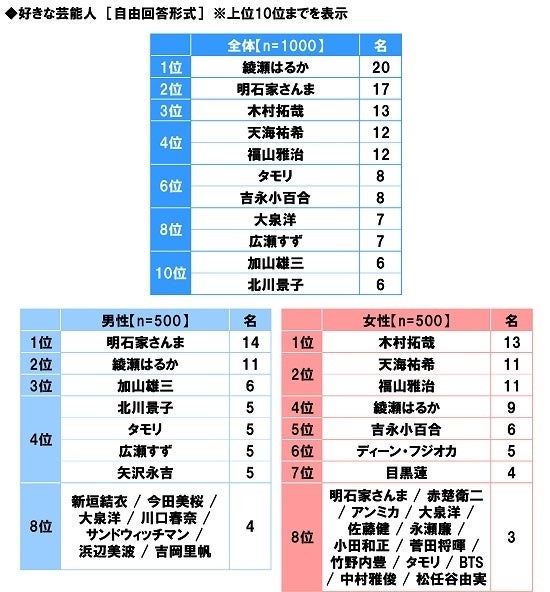 全回答者(1,000名)に、好きな芸能人を聞いたところ、1位「綾瀬はるかさん」、2位「明石家さんまさん」、3位「木村拓哉さん」となりました。