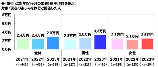 現在の楽しみを“旅行”と回答したシニア(399名)に、旅行に対する1ヶ月の出費を聞いたところ、平均額は2.9万円となりました。過去の調査結果と比較すると、平均額は2022年2.4万円→2023年2.9万円と、昨年と比べて0.5万円増加しました。