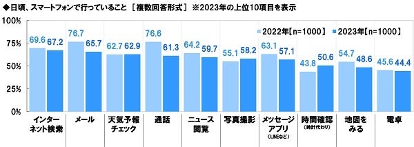 昨年の調査結果と比較すると、「メール」(2022年76.7%→2023年65.7%)は11.0ポイント下降、「通話」(2022年76.6%→2023年61.3%)は15.3ポイント下降し、「メール」は2022年1位→2023年2位、「通話」は2022年2位→2023年4位とそれぞれ順位を下げました。スマートフォンを使って、メールや電話でやり取りをするシニアが減少していることが明らかになりました。他方、「時間確認(時計代わり)」(2022年43.8%→2023年50.6%)は6.8ポイント上昇しました。外出先などで、腕時計の代わりにスマートフォンの表示を見て時間を確認するシニアが増えているのではないでしょうか。