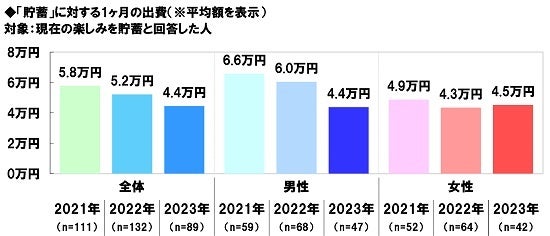また、現在の楽しみを“貯蓄”と回答したシニア(89名)に、貯蓄に対する1ヶ月の出費を聞いたところ、平均額は4.4万円となりました。過去の調査結果と比較すると、平均額は2021年5.8万円→2022年5.2万円→2023年4.4万円と、2年連続で減少しました。