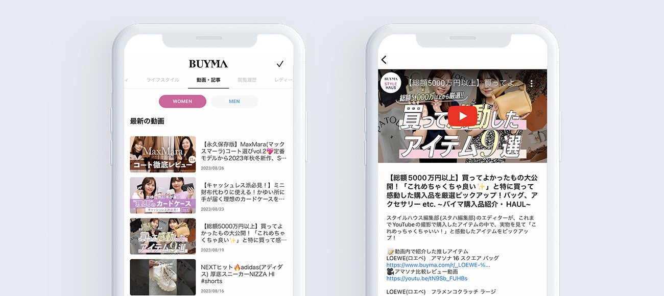 BUYMA iOSアプリバージョン3.55.0より、アプリ内で「BUYMA公式 / スタイルハウス編集部」「BUYMA MEN'S公式 / スタイルハウス編集部」のYouTubeがご視聴いただけるようになりました。