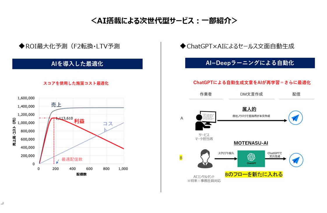 「MOTENASU-AI」は、従来多大な開発コストや人員を要していたMAにおいて、多様な外部連携にも対応できるマルチハイブリット型サービスとして最短3営業日内※で実装可能な画期的なソリューションサービスです。さらにAIによる再学習機能(ディープラーニング)を搭載し、従来不可とされていた多次元の分析や、商品自動レコメンド、ROI最適化予測を提供、さらにChatGPTによるセールス案内の自動生成も実装、MAによるCXサービスでEC、D2C、OMO領域の事業成長を強力に支援いたします。