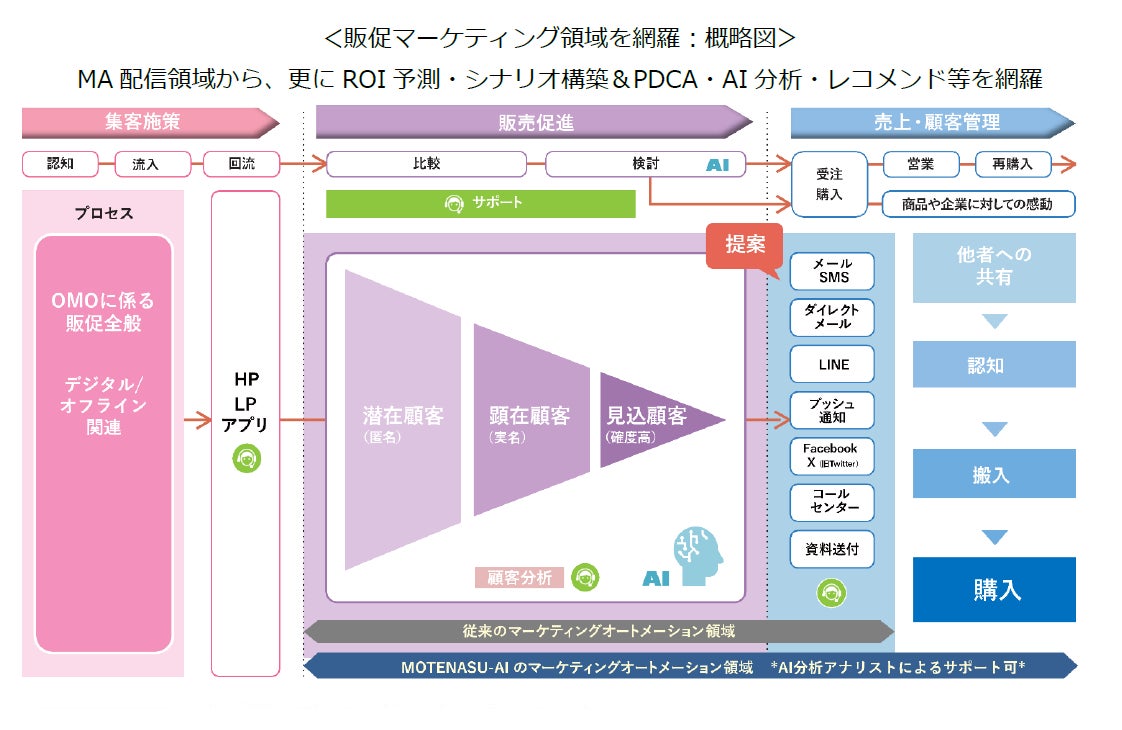 そこでFIDの高機能MA/CRMシステム「MOTENASU」に、電通プロモーションプラスの長年の販促プロモーションにおける豊富な知見と、AI開発領域で急成長を遂げている国内有数のパイオニアであるAI CROSSのAIテクノロジーを盛り込むことにより、上記の課題を解決するリアルタイム分析や予測、それによるパーソナライゼーションとCX(顧客は個別に適した体験を求める)を実現。購買履歴や行動データを活用しながら個々の顧客に適したOne-To-One販促プロモーションを実施によりLTVを向上させることができる、次世代AI搭載型MA「MOTENASU-AI」を開発いたしました。
