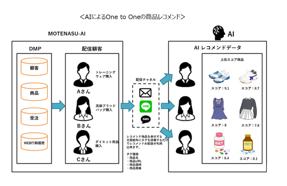 株式会社FID(本社:東京都新宿区、代表取締役CEO:和田 聖翔 以下「FID」)では、同社が提供する次世代型CRM/MA(マーケティングオートメーション)システム「MOTENASU」の進化版として、株式会社電通プロモーションプラス(本社:東京都千代田区、代表取締役社長執行役員:湯川 昌明、以下「電通プロモーションプラス」)、AI CROSS株式会社(本社:東京都港区、代表取締役CEO:原田 典子 以下「AI CROSS」)との共同開発による次世代AI搭載型MA「MOTENASU-AI」を、顧客向けのCRMやLTVの向上を目指す法人向けに提供開始します。CRM/MAにAIを活用することで、個別最適化された商品レコメンドや、ROI最大化、CRM分析の自動化を行い、One to Oneマーケティングを加速することでLTVの向上を実現します。