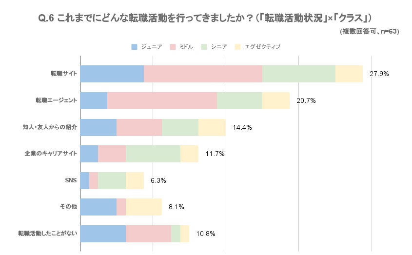 全体としては「転職サイト」、「転職エージェント」の順で多く活用されている結果になりました。いずれの役職でも「転職サイト」が大きいことから競合が多く、Web広告運用人材に対して積極的なアプローチをするとなると「転職エージェント」が有効そうです。その他、「知人・友人からの紹介」や「企業のキャリアサイト」の割合も一定あるものの、企業側からすると自社を認知してもらっていないと採用するのは厳しいと言えます。
