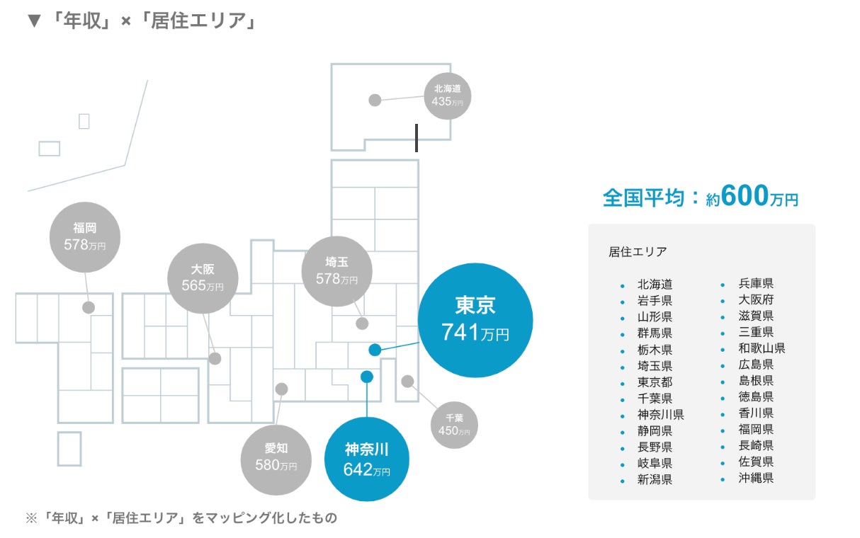 居住別でみると、全体平均年収623万以上のエリアは東京・神奈川のみ。