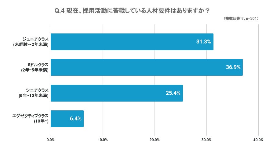 採用に苦戦している人材は、「ミドルクラス」が36.9%と最も高く、ニーズが高い層のため、企業側の採用難易度も高いことが想定される。