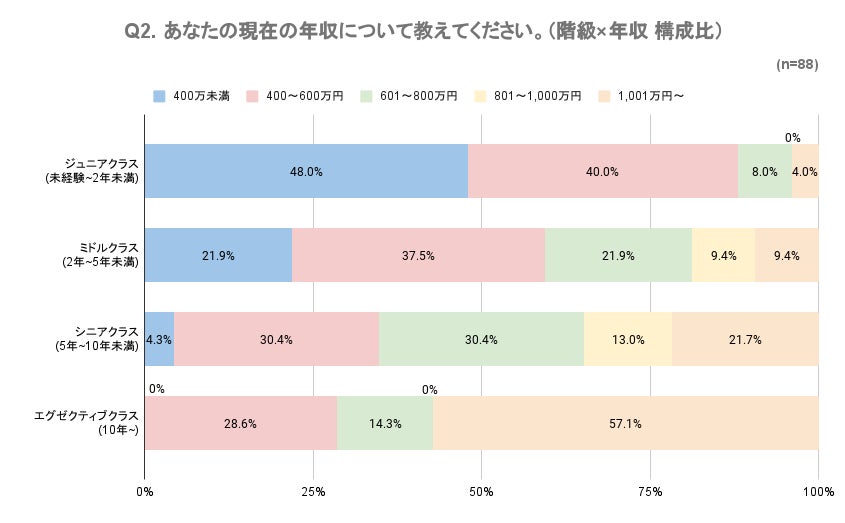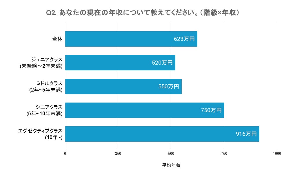 全体の平均年収は約623万円となり、階級別で見るとジュニアクラスの平均年収は約520万円、年収レンジとしては「400万円未満」が48.0%と最も高く、ミドルクラスは平均年収が約550万円、年収レンジは「400〜600万円未満」が37.5%で最多となっています。