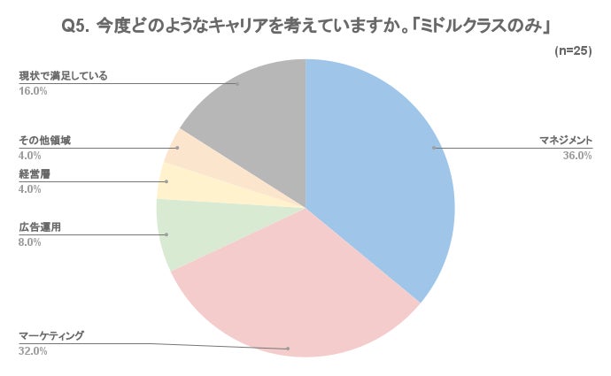 企業側の採用ニーズが高いミドルクラスの今後のキャリアについて質問すると、マネジメント職への希望が36.0%、マーケティング全般領域が32.0%と広告運用以外のマーケティティング領域への希望が全体の約7割を占める結果になりました。また広告運用領域での継続したキャリア展開希望の方は、8.0%と非常に低い結果となっています。