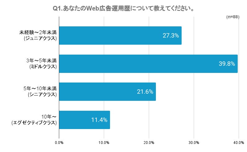 Q1,2では、現在も含めこれまでにWeb広告運用関連業務に従事したことのあるマーケティング職、広告・販促職の方88名に質問しました。