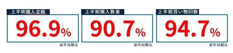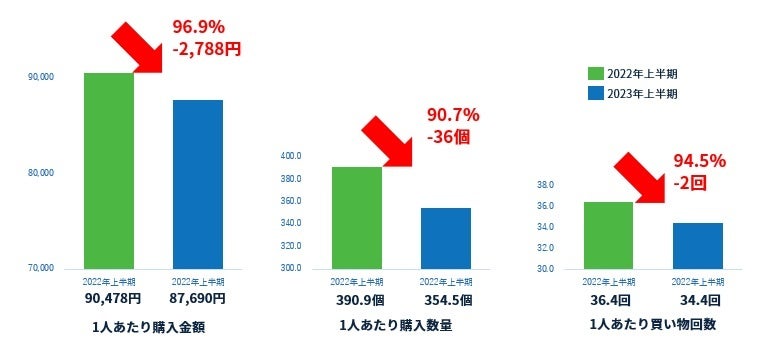 2023年上半期(1月~6月)の「購入金額」は前年同期比96.9%と約3%減少しました。「購入数量」は対前年同期比90.7%と約10%と大きく減少しており、「買い物回数」も対前年同期比94.7%と約5%減少しました。