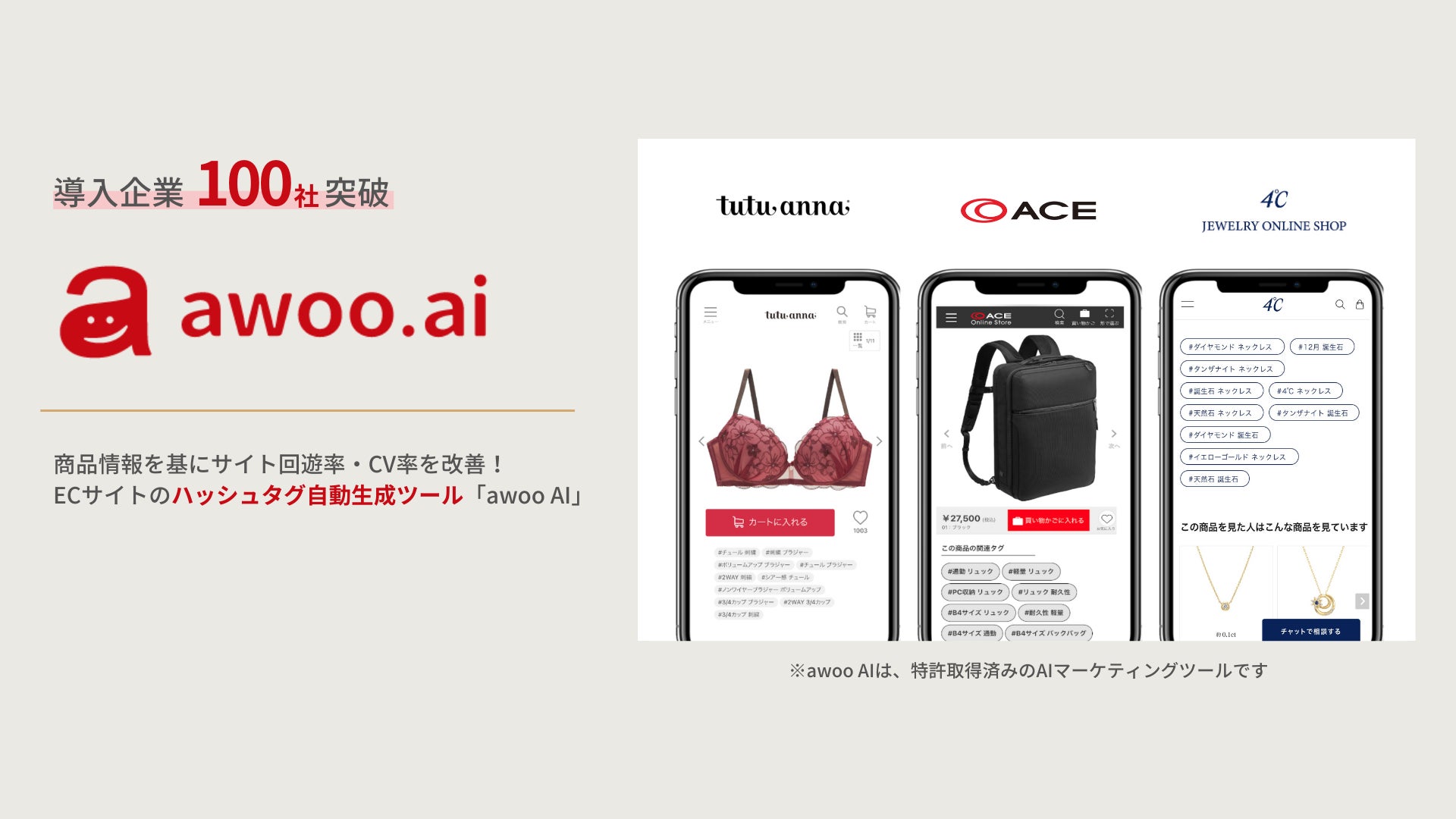 「awoo AI(アウーエーアイ)」は、回遊と購買を生むハッシュタグを自動で生成・最適化する「AIサジェストプラットフォーム」です。商品情報を基に “売れるハッシュタグ” を自動生成し、ECサイトの回遊率・CV率を改善します。