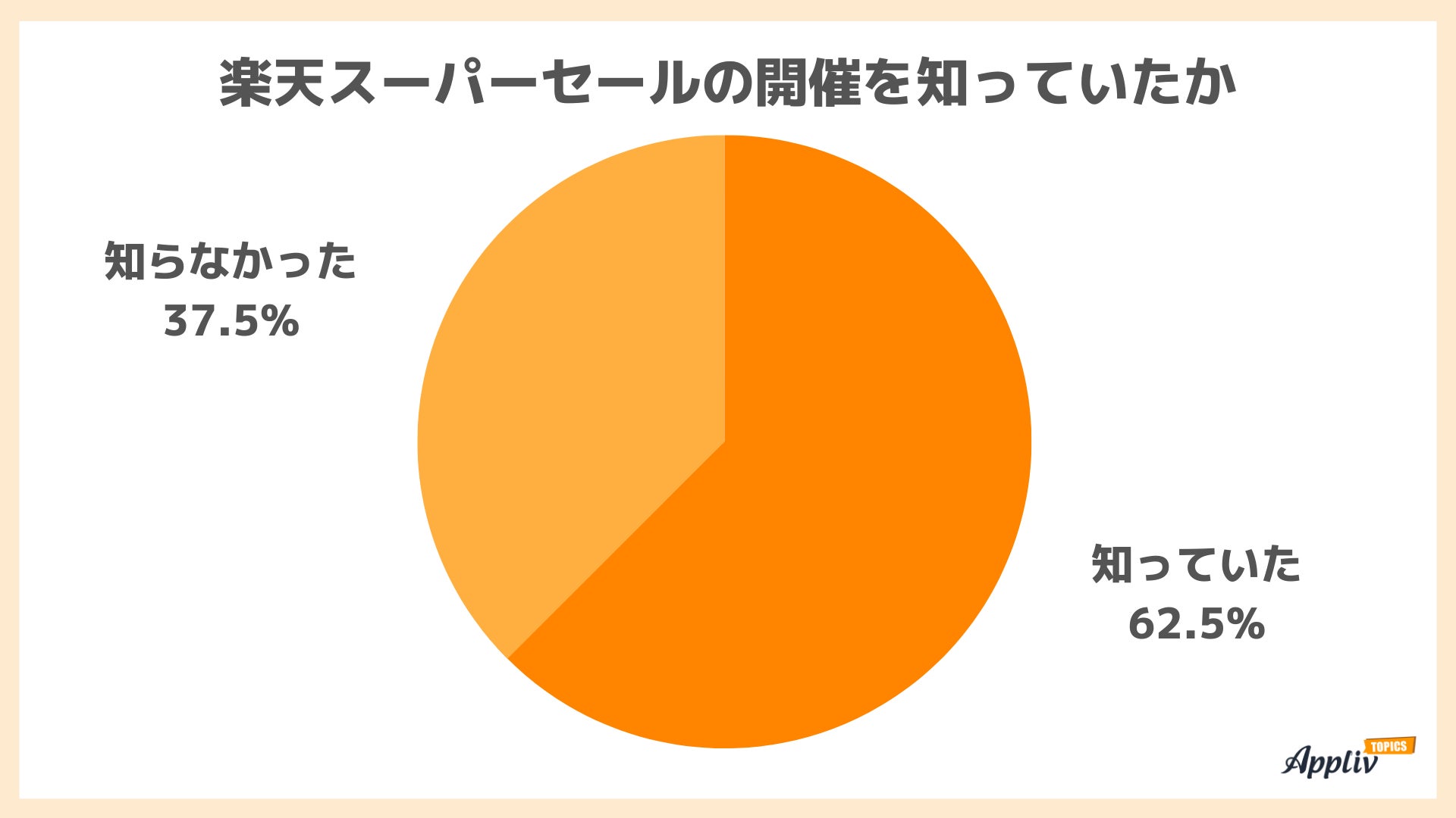 楽天市場で9月4日〜11日に「楽天スーパーセール」を開催していたことを知っていたかを質問したところ、「知っていた」と回答したのは62.5%。過半数が「楽天スーパーセール」の存在を知っていました。