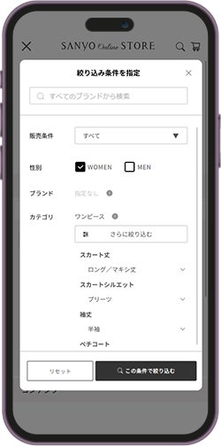 「SANYO ONLINE STORE」は、当社の中期経営計画における成長戦略の中のEC戦略の一環として、ECプラットフォーム刷新によるマルチブランド戦略を実現し、ブランドサイトとECサイトを統合してメディアコマース化することで、ブランディング強化とブランド間の買い回りを促進するCX向上を目指しています。また、OMO推進によりオンラインストアと実店舗の相互補完体制を確立し、ECと実店舗を横断したサービスをお客さまに提供することを目的としています。