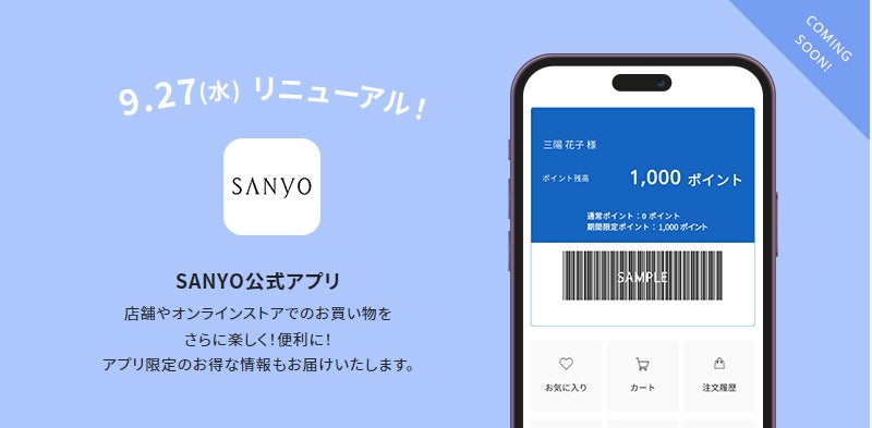 2023年9月27日(水)に既存の「SANYO MEMBERSHIP」アプリを改修し、新たに「SANYO公式アプリ」としてリニューアルいたします。メンバーシップ会員証機能を持たせるとともに、オンラインストアへの導線を強化します。