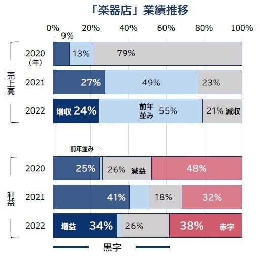 楽器販売の勢いが好調だ。2022年度の楽器店市場(事業者売上高ベース)は、前年度から0.6%増の1939億円となった。21年度の1927億円を上回り、2年連続で前年を上回った。また、売上高の動向では前年度から「増収」となった企業の割合は24%と、21年度(27%)に比べて縮小したものの、前年度並みを維持した企業の割合が多かった。損益ベースでは、22年度は「増益」が34%を占め、約6割が黒字を確保した。嗜好性の強い楽器では販売価格へ比較的反映させやすく、安定した利益を確保した楽器店が多かった。他方、楽器製造の原料となる金属や木材価格の高騰に加え、輸入品も多いことから物流費の上昇や円安による影響を受けて楽器の仕入れ価格が上昇しており、赤字となった企業も約4割を占めた。