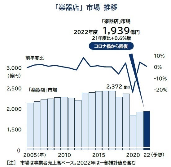 コロナ禍で打撃を受けた楽器店市場は、足元では行動制限の緩和や「5類」移行による音楽教室の再開、ライブ活動・コンサート向けの楽器需要が回復傾向にある。また、アニメなどの影響も重なり、楽器演奏に新たにチャレンジする巣ごもり需要などの発生が楽器店市場を下支えし、2年連続で前年度を上回るなど、ポストコロナに向かうなかで市場回復の兆しが見えつつある。
