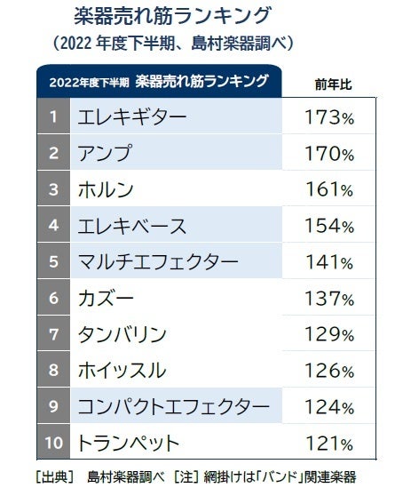 国内最大手の島村楽器によると、22年度下半期に販売した楽器のうち、前年から最も伸長したのは「エレキギター」で73%増加したほか、アンプやエレキギターなど「バンド関連」楽器が上位を占めた。過去には、『涼宮ハルヒの憂鬱』や『けいおん!』、『響け!ユーフォニアム』などのテレビアニメ・マンガ作品がきっかけとなり、音楽に興味を持ったライト層向けの楽器販売が好転したケースは多く、楽器演奏人口のすそ野の広がりにも寄与している。