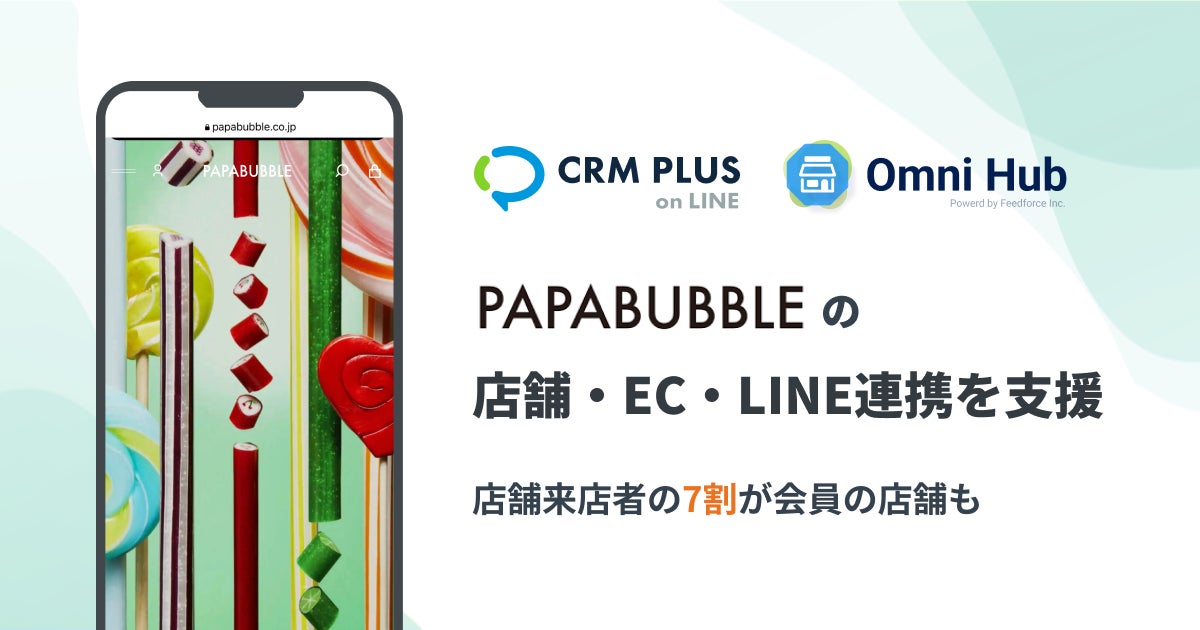 株式会社フィードフォース(所在地:東京都港区、代表取締役:塚田 耕司)が提供するアプリ「Omni Hub」と株式会社ソーシャルPLUS(所在地:東京都港区、代表取締役:岡田 風早)が提供するアプリ「CRM PLUS on LINE」は、株式会社PAPABUBBLE JAPANが運営する「PAPABUBBLE(https://papabubble.co.jp/)」の店舗・EC・LINE連携ソリューションとして採用されました。
