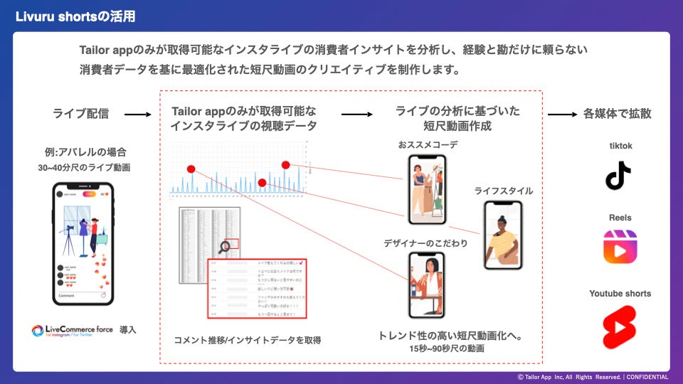 戦略型ライブコマースの「LIVURU(ライブル)」(https://livuru.jp/)を提供する、株式会社テイラーアップ(所在地:東京都渋谷区、代表取締役社長:松村 夏海)は、短尺動画の制作サービス「LIVURU SHORTS(ライブルショーツ)」の提供を開始いたしました。LIVURU SHORTSは、テイラーアップのみが取得可能なインスタライブの視聴者インサイト分析サービス「ライブコマースフォース」の分析を基に、短尺動画を制作するサービスです。LIVURU SHORTSでは、ブランドのファンの興味・関心によりフィットした動画を作ることが可能となります。