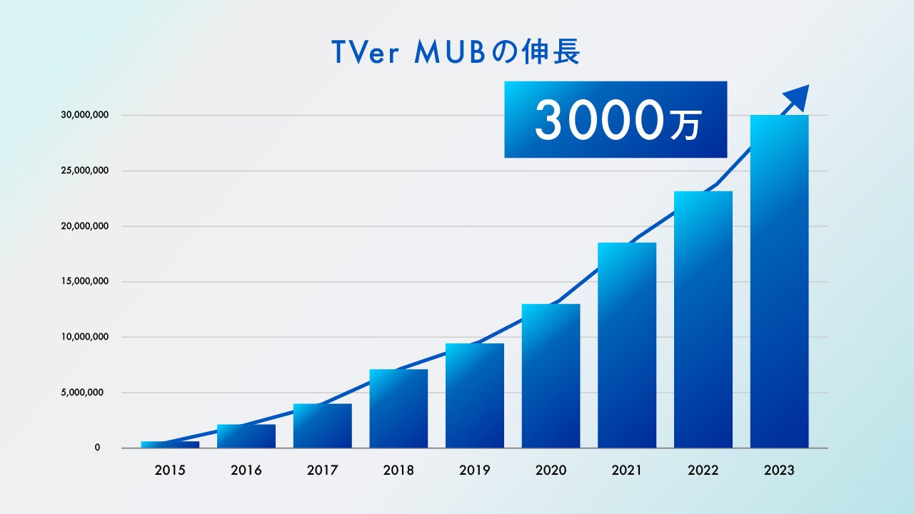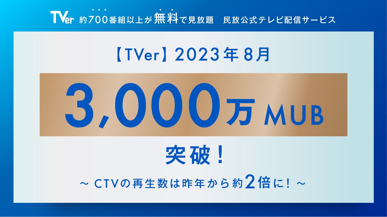 株式会社TVer(本社:東京都港区、代表取締役社長:若生伸子)は、民放公式テレビ配信サービス「TVer (ティーバー)」の2023年8月における月間ユニークブラウザ数(以下、MUB)3,000万(※1)を突破し、本年5回目となる過去最高記録を更新。月間動画再生数も3.9億回(※2)を達成したことをお知らせいたします。