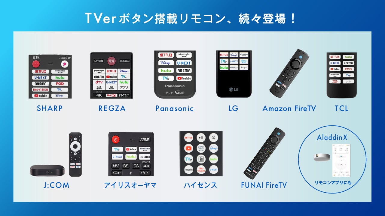 2023年は新たにハイセンス(22年・23年発売モデル)、LG(20-23年発売モデル)、レグザ(18年以降発売モデル)への対応を行い、TVerが利用できるテレビデバイスがますます拡大しました。また、リモコンにTVerボタンが設置されているテレビ・ストリーミングデバイスが増加しており、現在は下記のリモコンにTVerボタンが設置されています。(※3)
