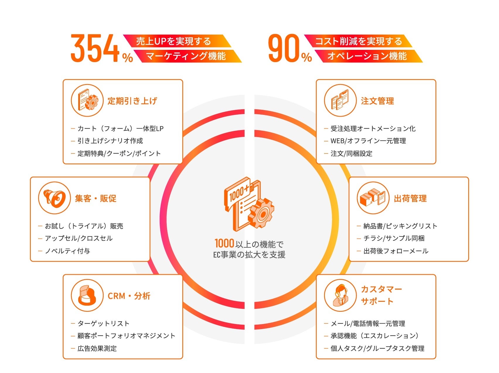 アサヒビールでは、ECカートシステムの選定にあたって、定期通販に必要な機能が揃っていることが選定の必須条件でした。W2のECプラットフォームは1,000以上の機能を持ち、「W2 Repeat」は、定期通販で必要な機能のほとんどが標準機能として搭載されているD2Cリピート通販向けECプラットフォームです。「THE DRAFTERS(ドラフターズ)」でも、大規模開発をおこなわずにシステムを完成することができました。W2のECプラットフォームは、注文・出荷管理などのEC機能はもちろん、メルマガ配信などのマーケティング機能、そしてお客様からのお問い合わせ管理ができるカスタマーサポート機能が標準搭載されていることも強みです。圧倒的な製品力で、サブスク・D2C事業に取り組むEC事業者様をサポートし、事業成長に貢献します。