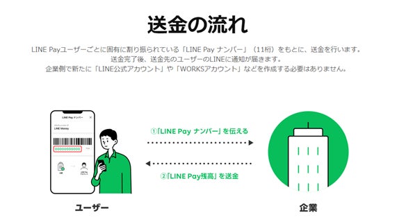 LINE Payユーザーごとに固有に割り振られている「LINE Pay ナンバー」をもとに、送金を行います。24時間365日いつでもLINE Pay残高を送金でき、送金完了後、送金先のユーザーのLINEに通知が届きます。
