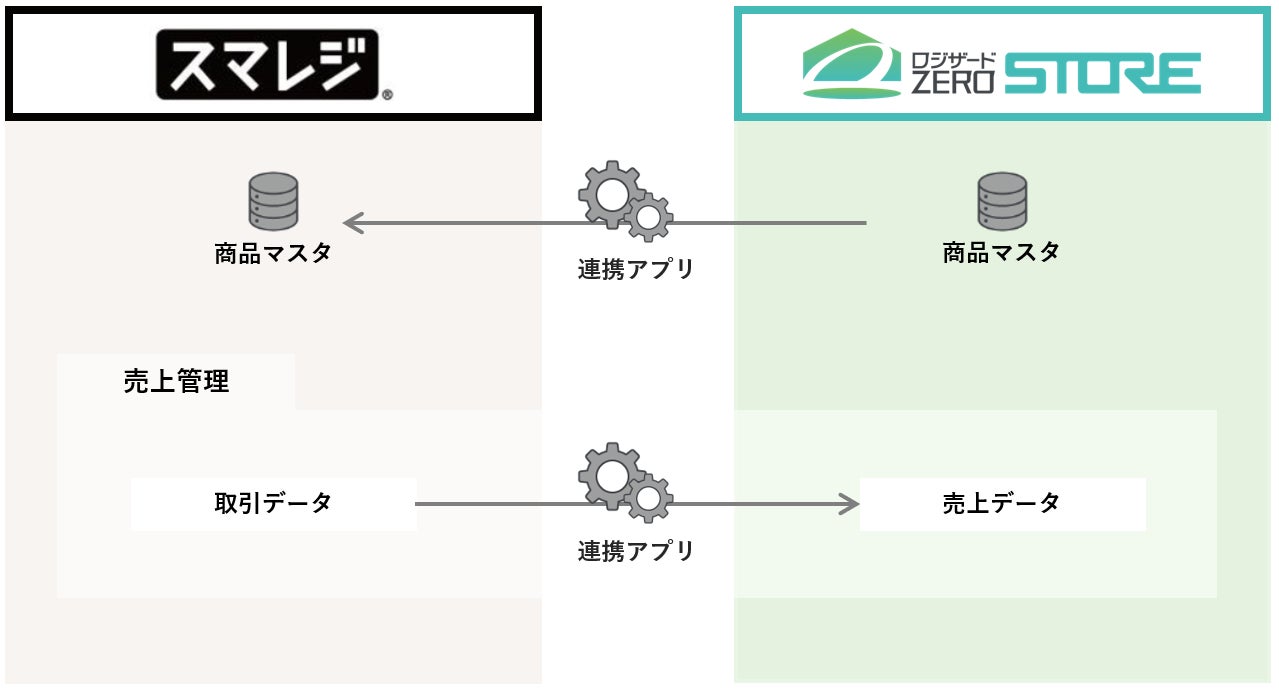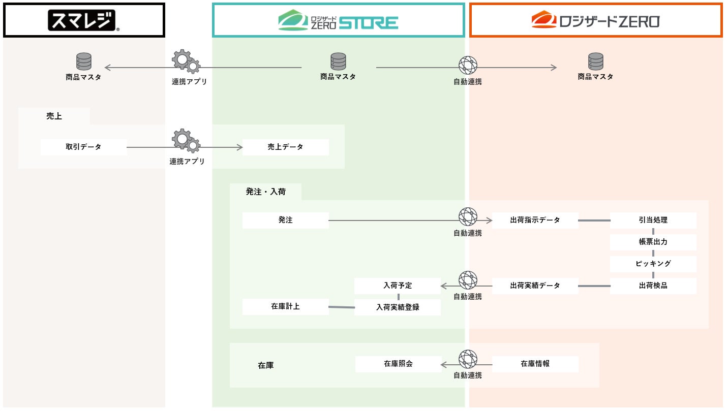 「ロジザードZERO-STORE」から商品マスタの連携、「スマレジ」からは取引データを連携し、「ロジザードZERO-STORE」では売上データとして取り込むことが可能です。