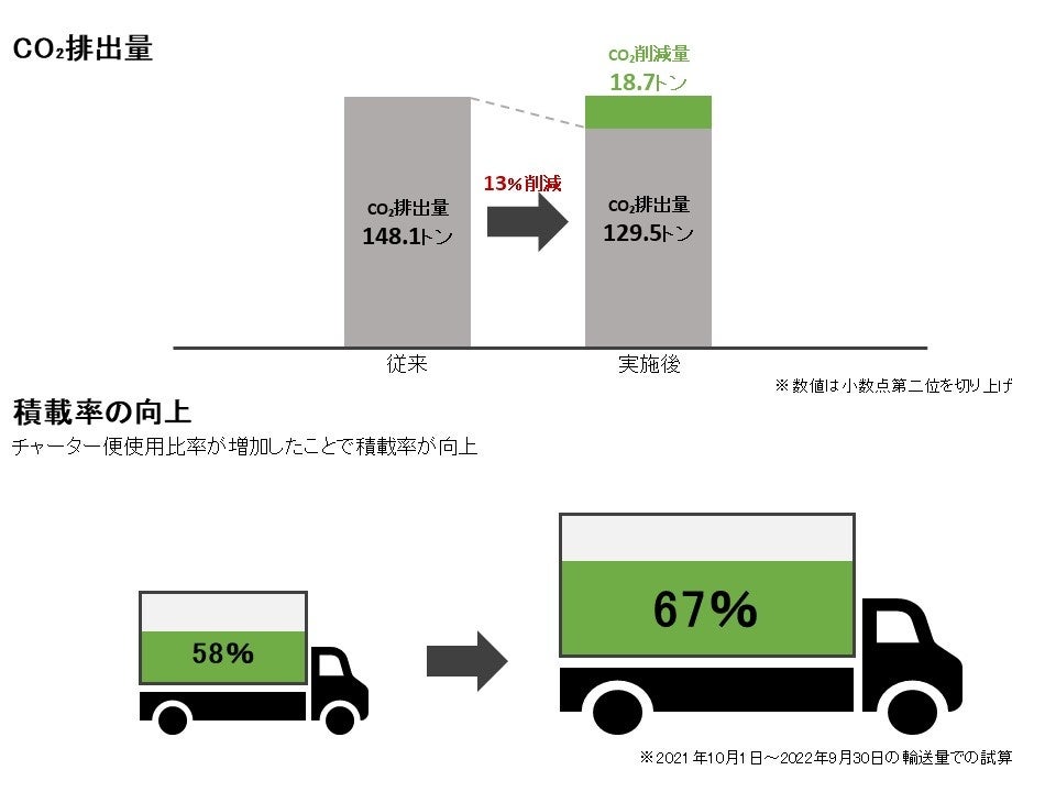 本実証実験を通じて輸送車両の集約化を実現し、同一の輸送物量に対してのCO2排出量を削減、車両積載率を向上させました。この結果を踏まえ、2022年10月より本格稼働し、両社の物量調整を実施しながら現在も取り組みを継続しています。