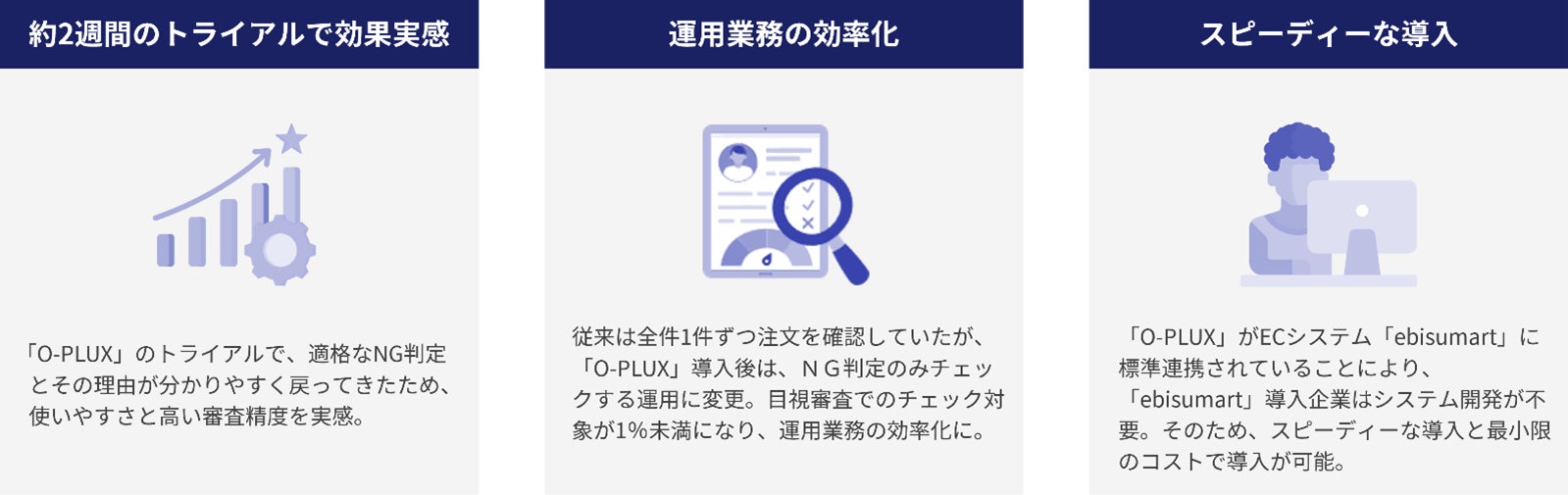 これまで、不正被害が発生していなかったことから、自社での対策は行っていませんでしたが、単価6万円の商品でクレジットカード不正が複数件発生するようになりました。これをきっかけに、自社で対策をするようになりました。一時はクレジットカード不正利用の被害を保障する「チャージバック保険」を検討しましたが、既にカードの不正利用被害を経験していたため入ることができず、その代わりに不正検知サービスの導入を検討していました。現在利用しているECシステム「ebisumart(エビスマート)」の提供会社であるインターファクトリーのご紹介により、「O-PLUX」のトライアルを実施し、効果を確認できたため導入を決めました。