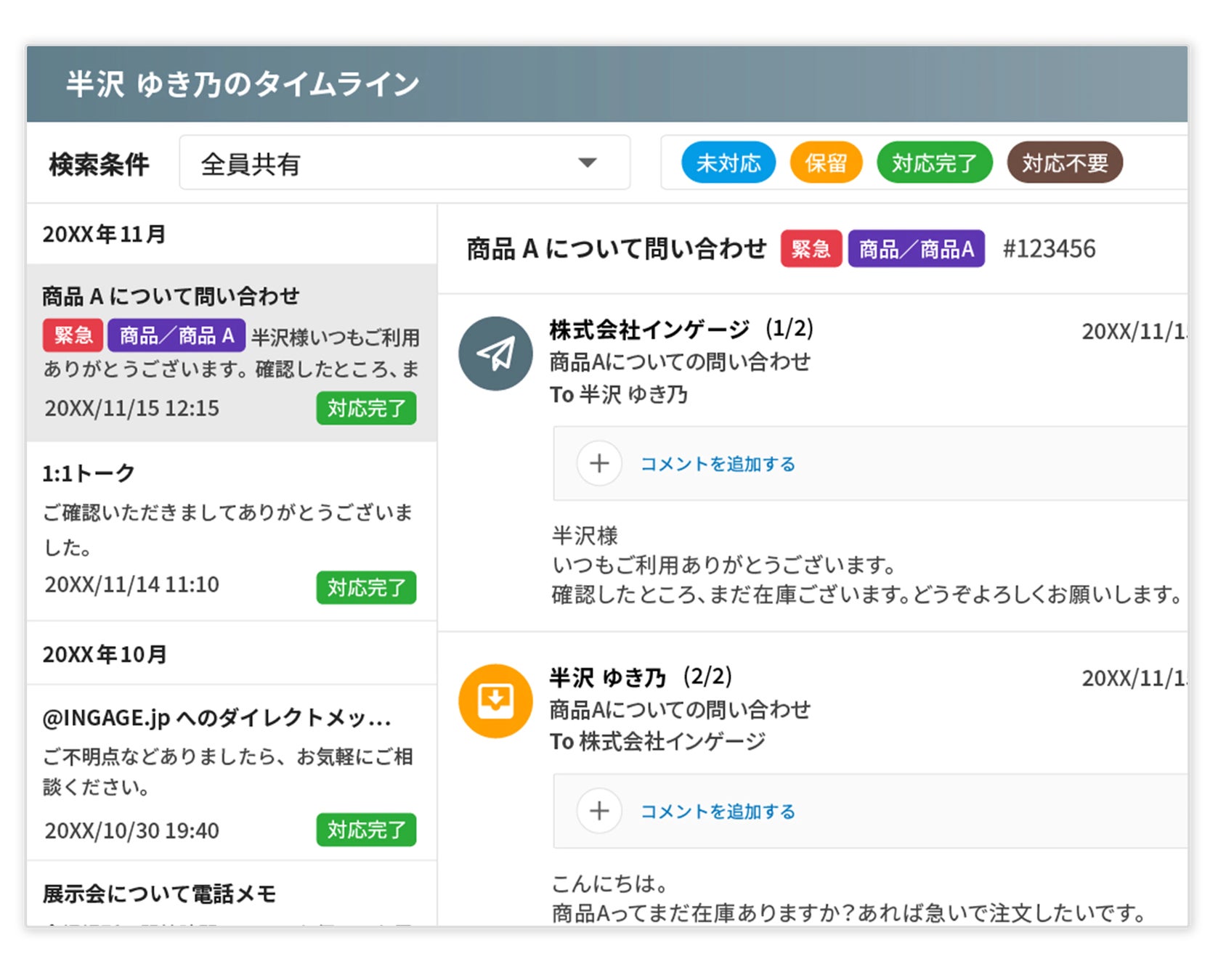 どのチャネルからくるお問い合わせも、全てタイムラインに反映され、お客さまごとの対応履歴をワンクリックで時系列順に確認できます。ステータス管理によって対応状態がひと目で分かるため、お客さま情報の取り違えや確認漏れも防ぎます。