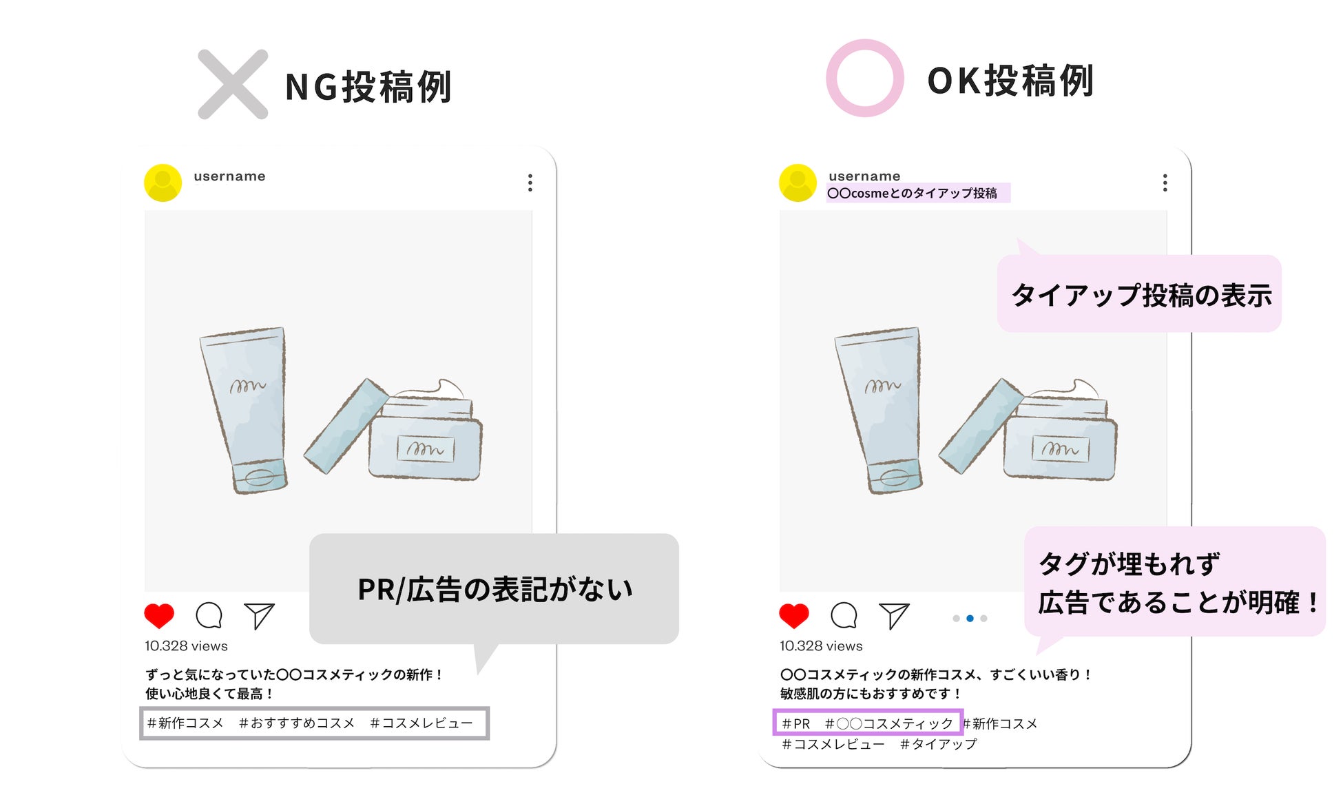 PR投稿に関しては必ず表示義務が発生します。消費者を誤認させるような隠れたマーケティング手法は法的に規制されます。たとえ金銭の授受が発生していなくても、表示義務に違反した場合は、措置命令の対象になる可能性があります。さらに措置命令に違反した場合は刑事罰の対象となります。