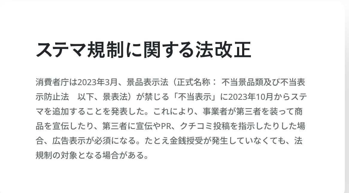 薬機法・景品表示法・特定商品取引法に基づく、広告クリエイティブのリーガルチェック事業を手がける株式会社REGAL CORE(東京都渋谷区、代表取締役社長:田之上 隼人、以下REGAL CORE)は、2023年10月1日以降ステルスマーケティング(ステマ)が景品表示法により規制されることへの対応として、最短10秒でインフルエンサーの投稿内容がステマに当たらない投稿か判定できる「SNSステマチェッカー」の提供開始したことをお知らせします。