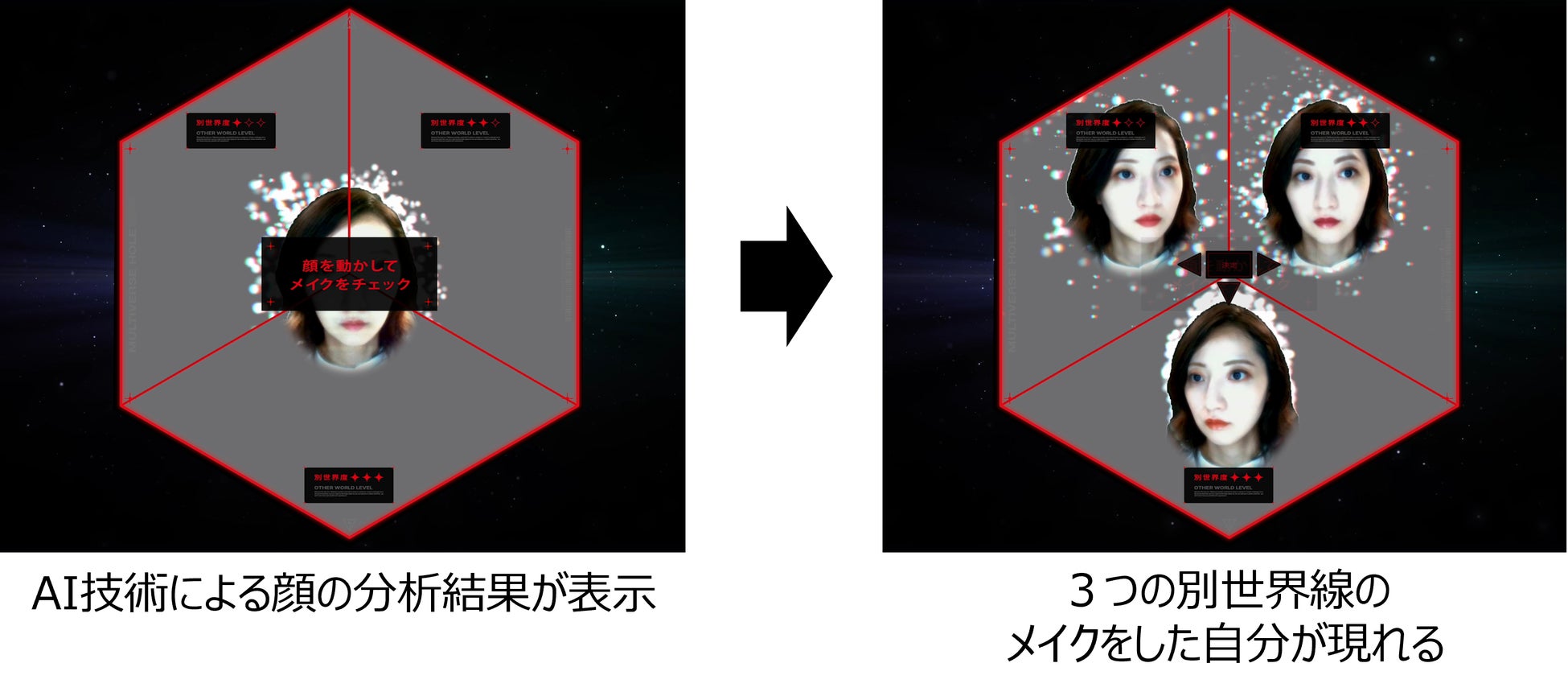 AI技術による顔のパーツ比率×肌の色の分析結果から、3つの別世界線のメイクをした自分が現れます。