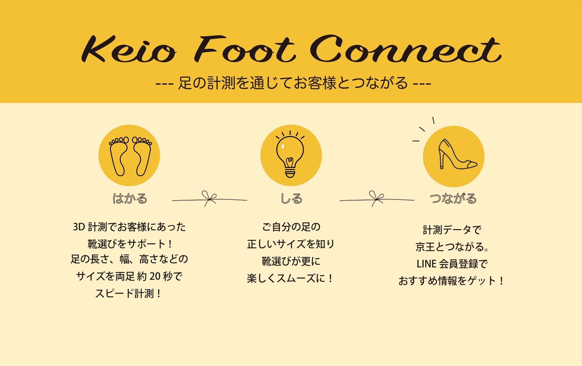 株式会社京王百貨店(本社:東京都新宿区、社長:仲岡一紀)は、9月28日(木)、両足約20秒とスピード計測ができる3D足型計測器を導入したサービス「Keio Foot Connect(京王フットコネクト)」を新宿店1階 婦人靴売場で開始しました。新宿店グランドフロアにて約80ブランドを取り扱い、ウォーキングシューズや高機能パンプスの展開とシューフィッターによるコンサルティングセールスを強みとする自主編集型の同売場。靴選びのお悩みは“なんとなく靴が合わない・歩きづらい”といったものも多く、何足も履き比べながら気になるポイントを絞っていきます。その際、計測器の上に立つだけで複数箇所を簡単に計測できる客観的なデータをもとにご提案することで、よりスムーズに納得感・満足感のある靴選びにつなげていきます。加えて、「京王百貨店 新宿店 LINEミニアプリ」を通じてお客様におすすめの靴の発売情報なども配信。店頭での接客需要が依然として高い靴をフックに、お客様一人ひとりにあわせた靴選びのお悩み解決や提案力を高めることで、お客様との“つながり”の強化を目指します。