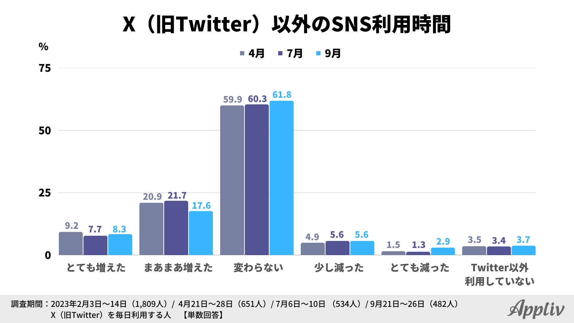 また、2023年7月以降にX以外のSNSを利用する時間を見ると、「変わらない(61.8%)」が最も多く、増えた人は25.9%、減った人は8.5%となりました。