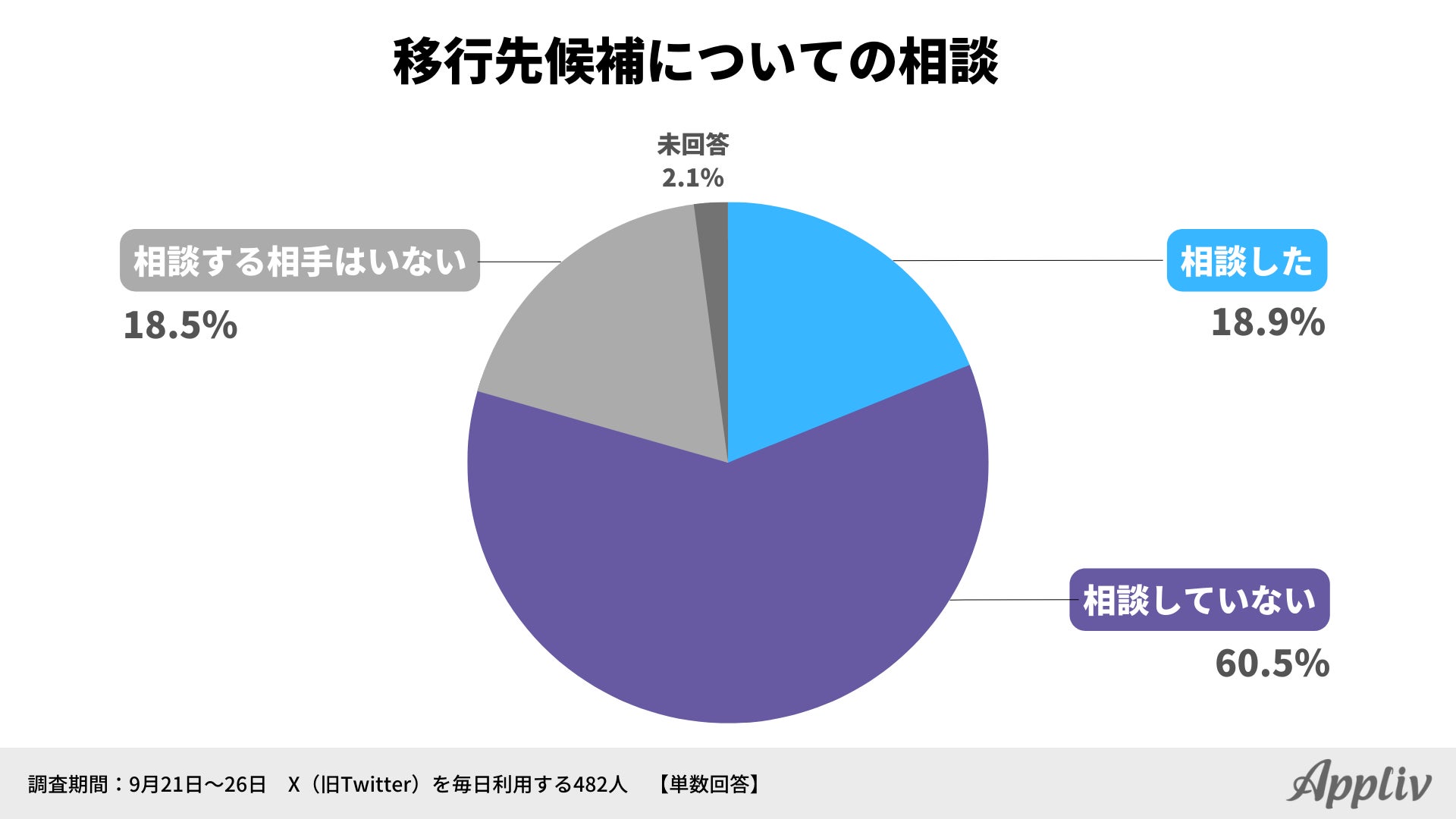 フォロワーまたはフォロイーと、移行先候補の相談をしたことがあるかを尋ねたところ、「相談した」が18.9%、「相談していない」が60.0%でした。