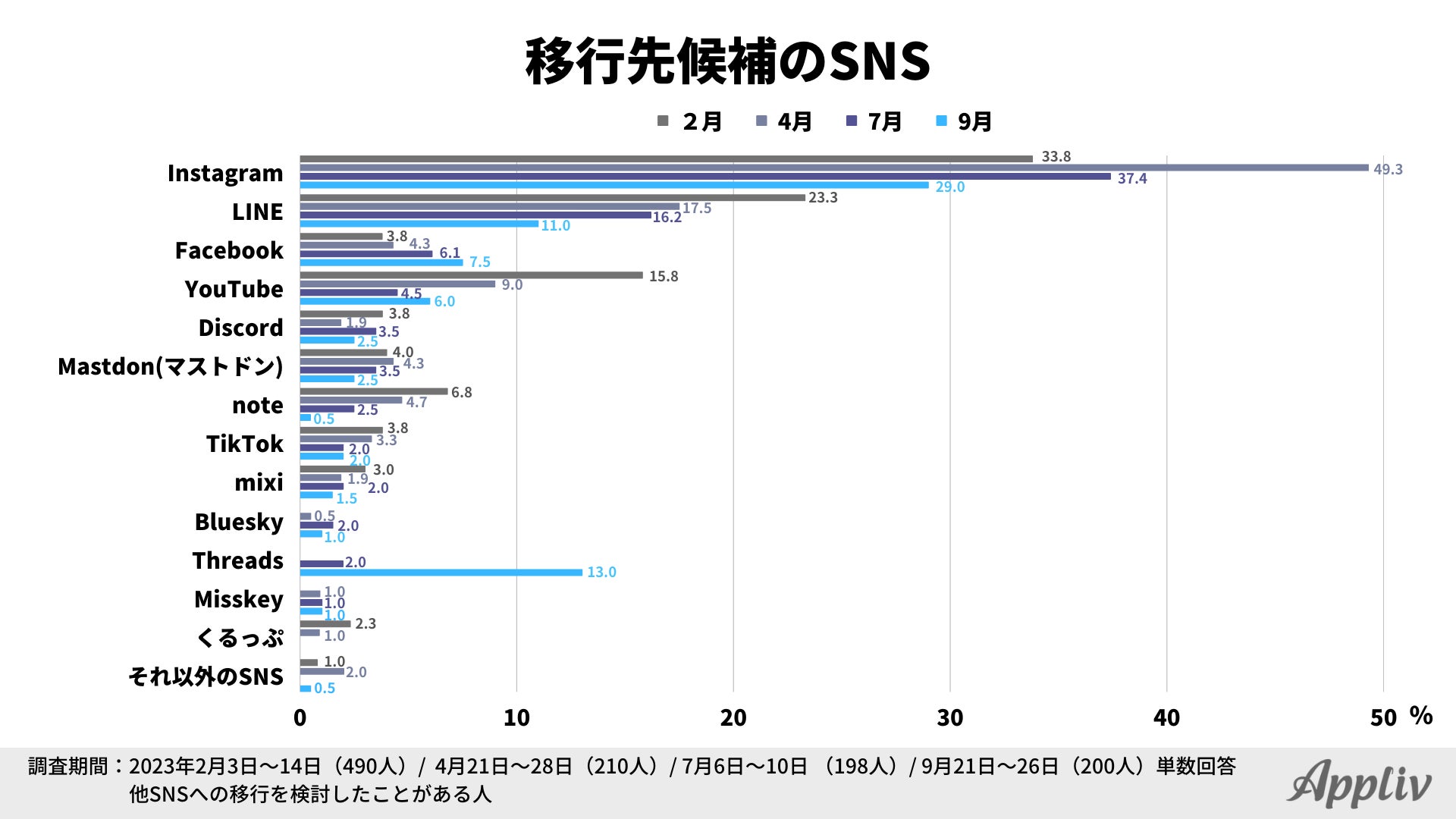 移行先の候補となっているSNSを調査した結果、1位『Instagram(29.0%)』、2位『Threads(13.0%)』、3位『LINE(11.0%)』でした。