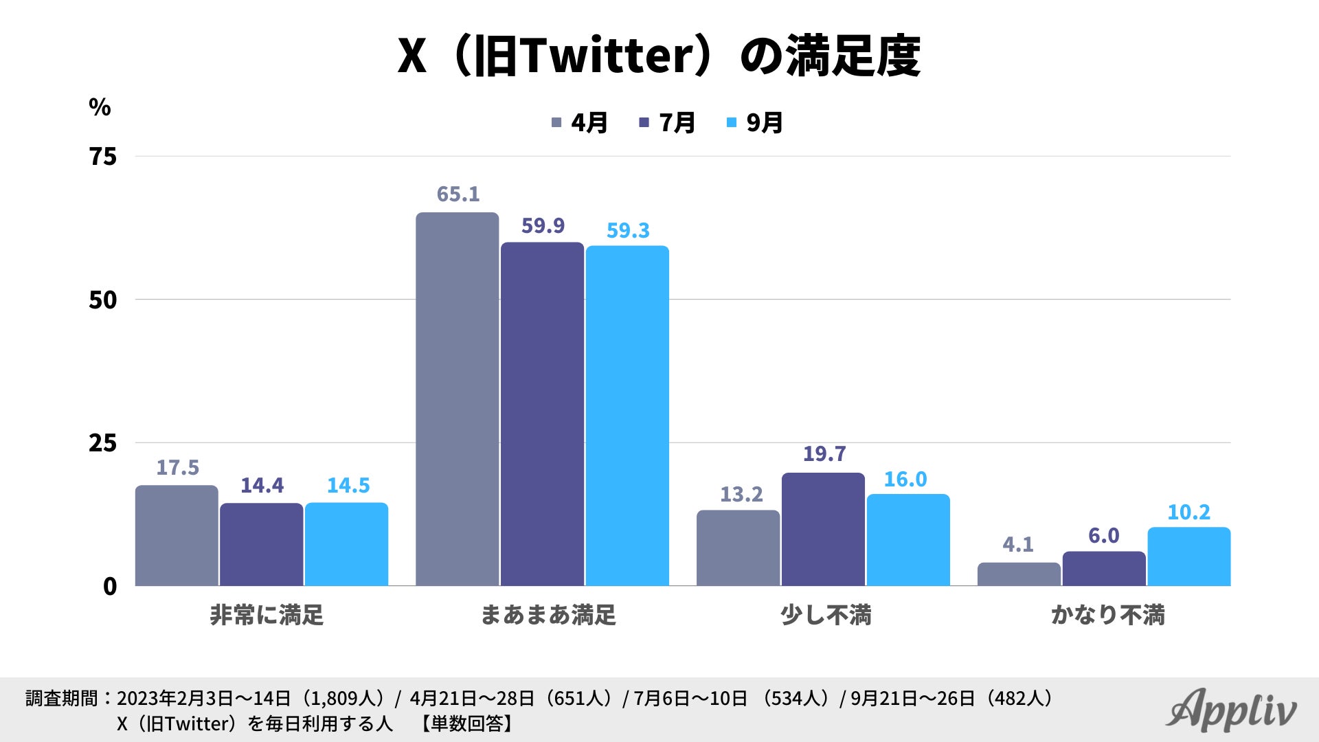 Xの満足度について尋ねると、不満を感じている割合は「少し不満(16.0%)」、「かなり不満(10.2%)」を合わせて26.2%で、前回調査の25.7%から微増。ユーザーの約4人に1人が、不満を感じながらXを利用しているようです。