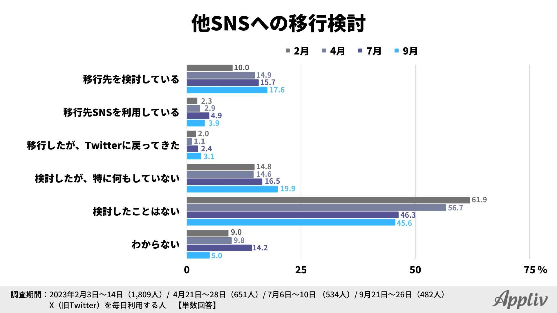 他SNSへの移行を検討する割合が増え続けている一方、移行の意思はあるが何も行動していない人の割合も増えており、今回の調査では過去最高の19.9%でした。