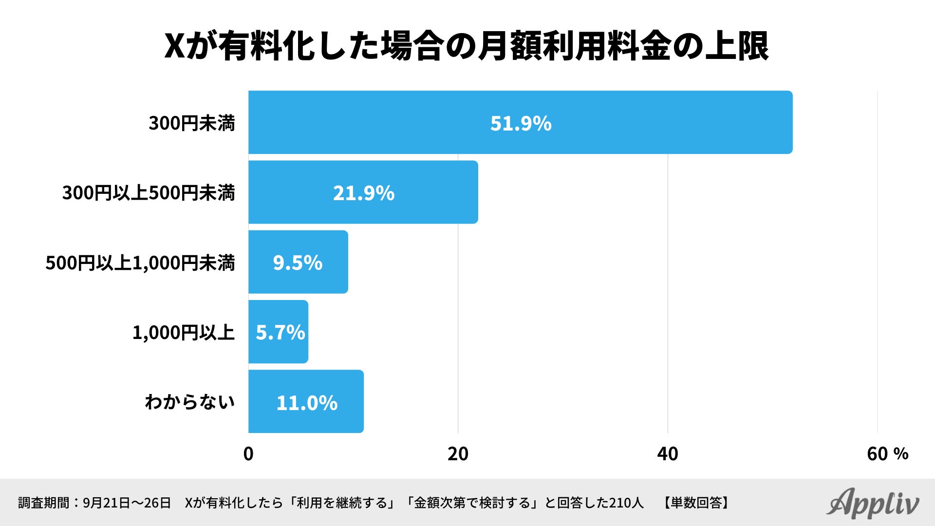 継続利用希望者の半数以上が500円未満と回答していることから、お金を払ってでも継続したい意思はあるが、現状の有料プラン「X Premium」よりも安価な料金を希望している人が多いことが分かります。